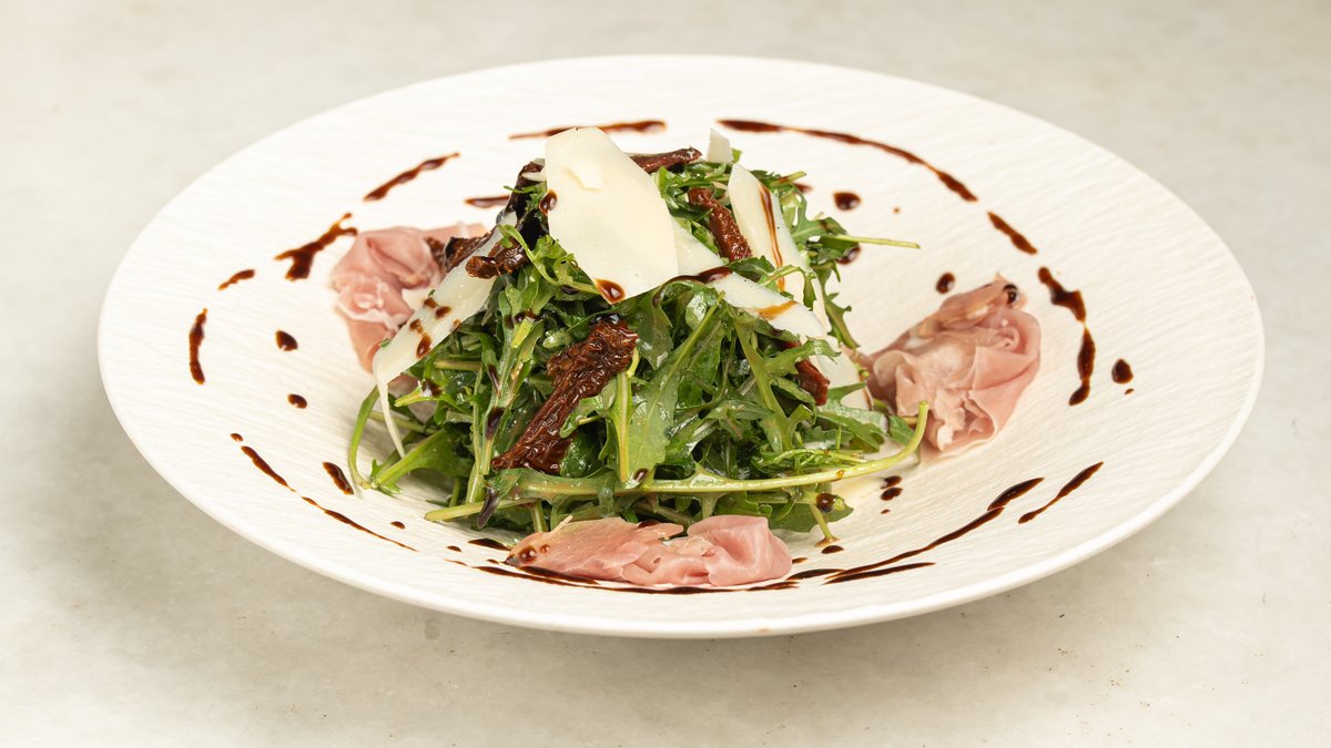With baby arugula, prosciutto crudo, sun dried tomato, parmesan flakes, balsamic dressing and balsamic cream