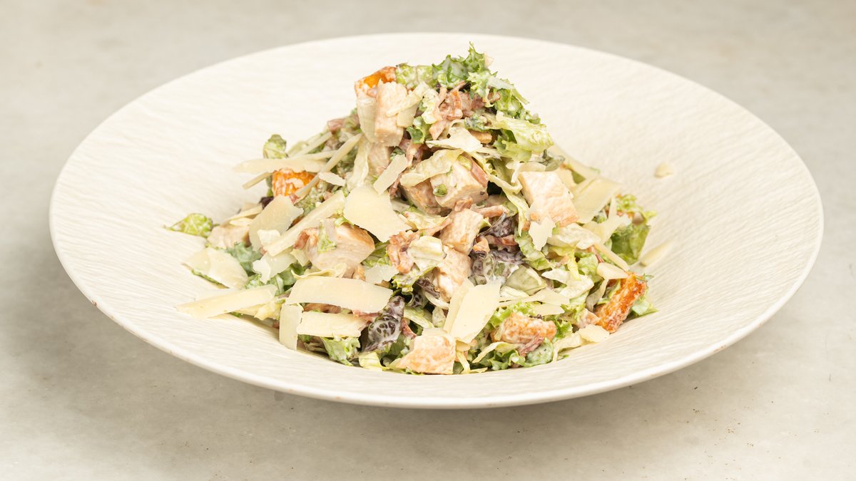 With green and red lola, iceberg, chicken, bacon, handmade croutons, parmesan flakes and ceasar's dressing