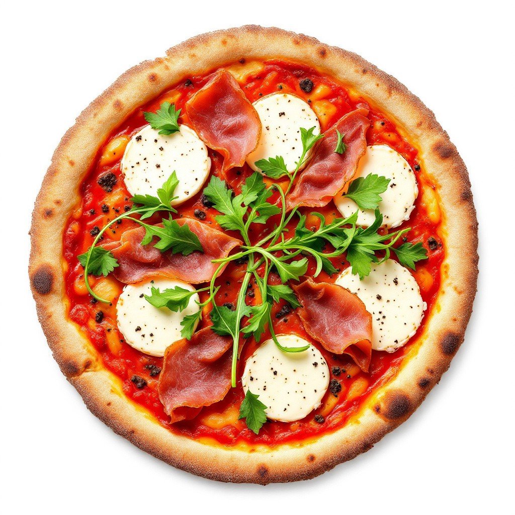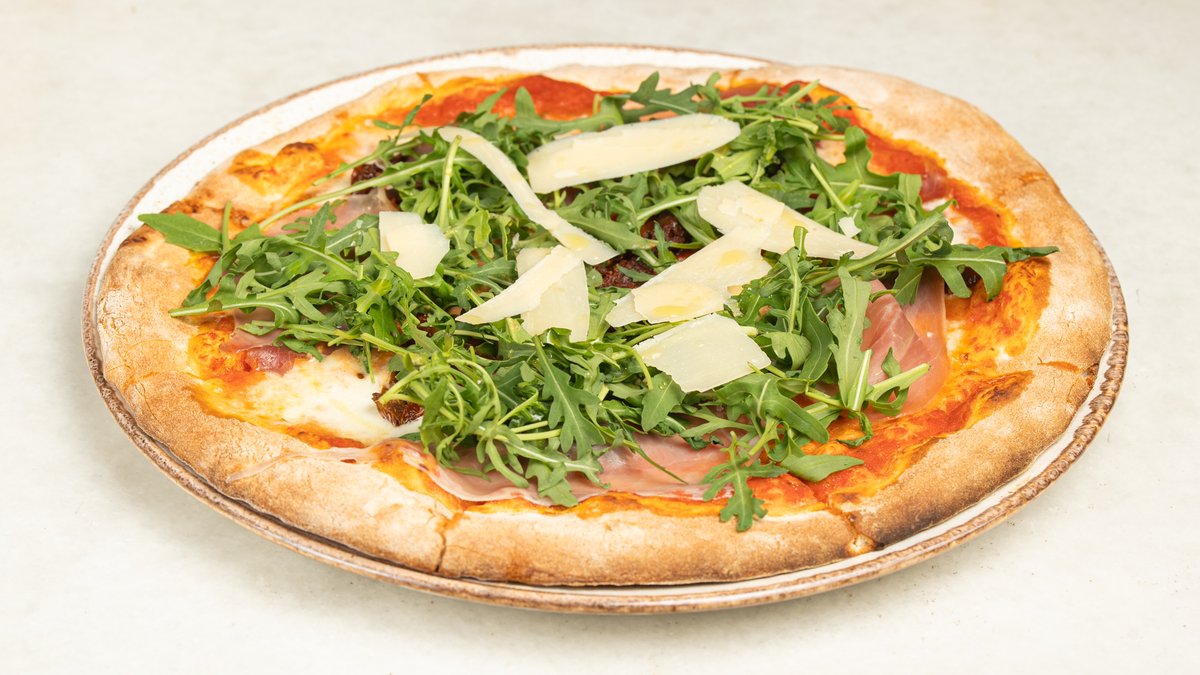With fresh mozzarella, sauce, prosciutto crudo, sundried tomato, rocket and parmesan flakes