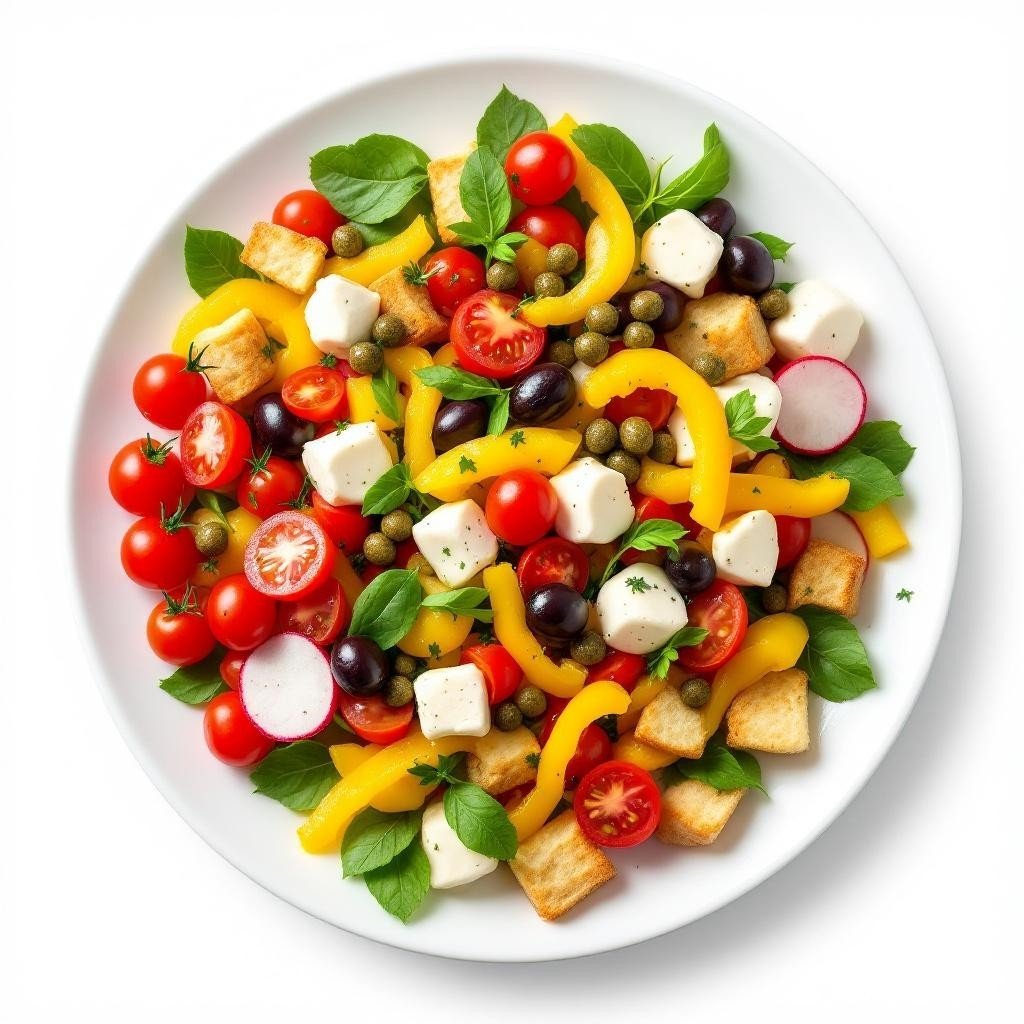 With cherry tomatoes, yellow and red peppers, mozzarella, olives, capers, radish, croutons and vinaigrette