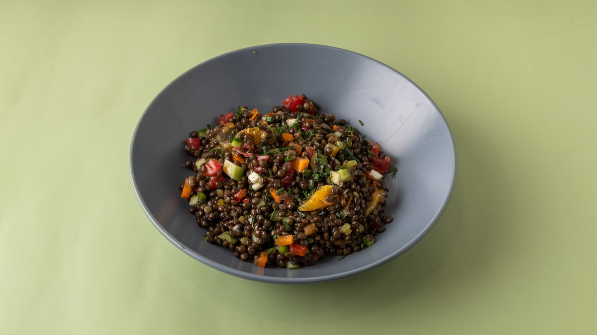 Αποτελείται από φακές, πολύχρωμες πιπεριές, καρότο, ντοματίνι, αγγούρι, κρεμμύδι, μαϊντανό, φέτα πορτοκαλιού και βινεγκρέτ βαλσάμικου