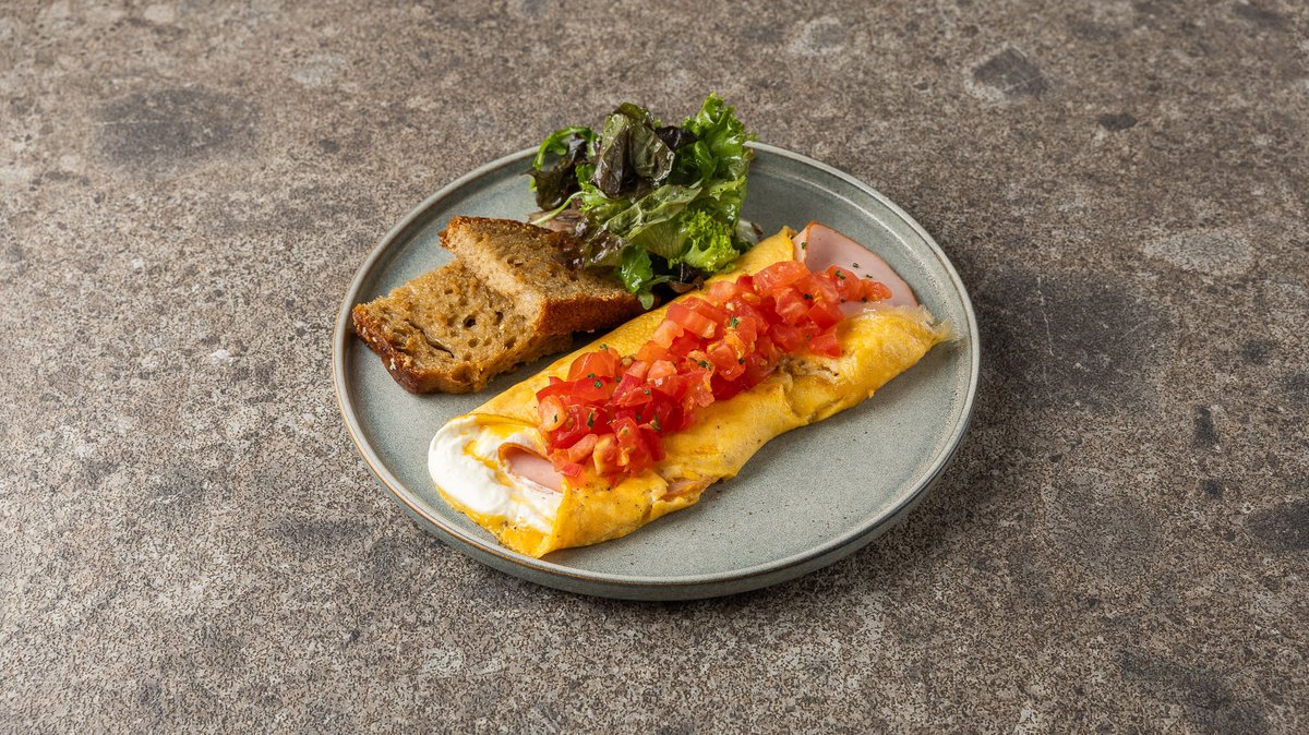Γαλλική Ομελέτα με Ντομάτα Καρέ, Καπνιστή Γαλοπούλα, Παρμεζάνα, Σχοινόπρασο, Φρυγανισμένο Ψωμί και Πράσινη Σαλάτα