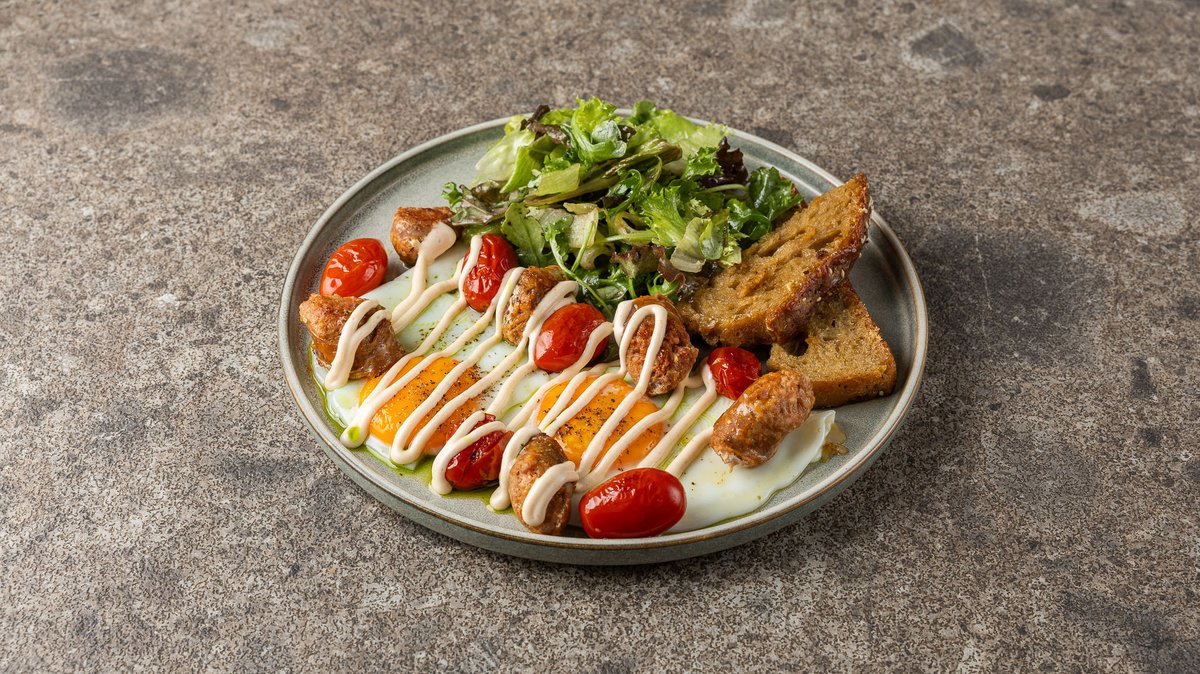 Τηγανιτά Αυγά με Ντοματίνια Confit, Χωριάτικο Λουκάνικο, Spicy Aioli, Λάδι Μυρωδικών, Φρυγανισμένο Ψωμί και Πράσινη Σαλάτα