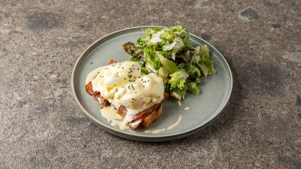 Αυγά Benedict με Αυγά Ποσέ, Bacon, Σάλτσα Hollandaise, Σχοινόπρασο, Φρυγανισμένο Ψωμί και Πράσινη Σαλάτα