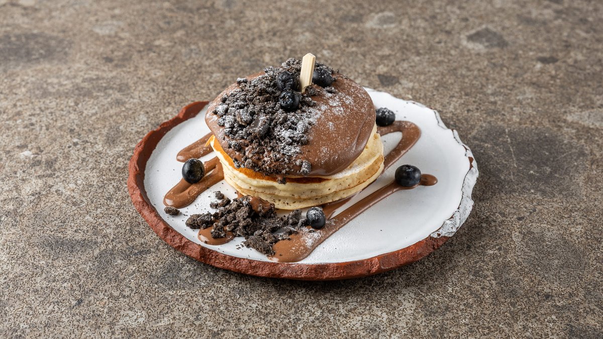 Serious Pancakes με Πραλίνα Φουντουκιού, Μπισκότο Oreo, Φρέσκα Κόκκινα Φρούτα και Ζάχαρη Άχνη