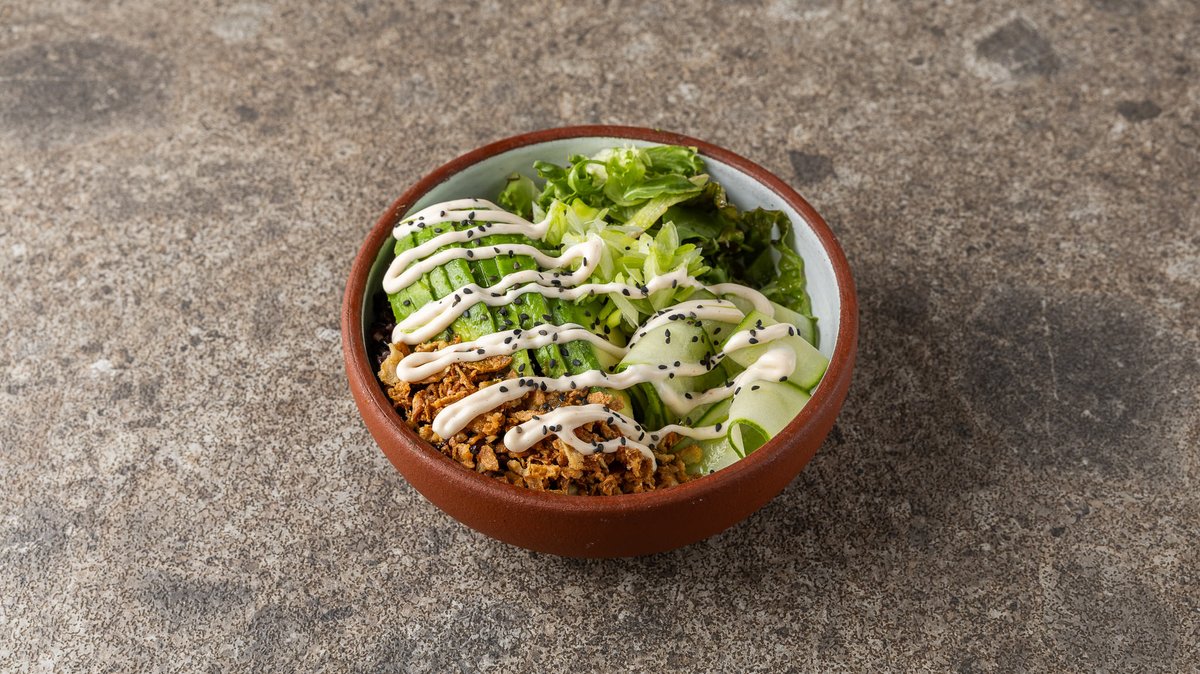 Buddha Bowl με Μαύρο Άγριο Ρύζι, Αγγούρι, Πράσινη Σαλάτα, Avocado, Τηγανιτό Κρεμμύδι, Φρέσκο Κρεμμύδι, Μαύρο Σουσάμι και Spicy Aioli