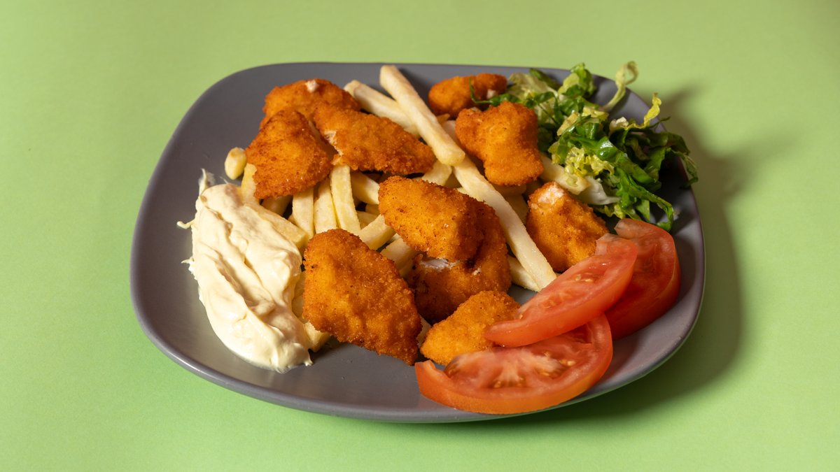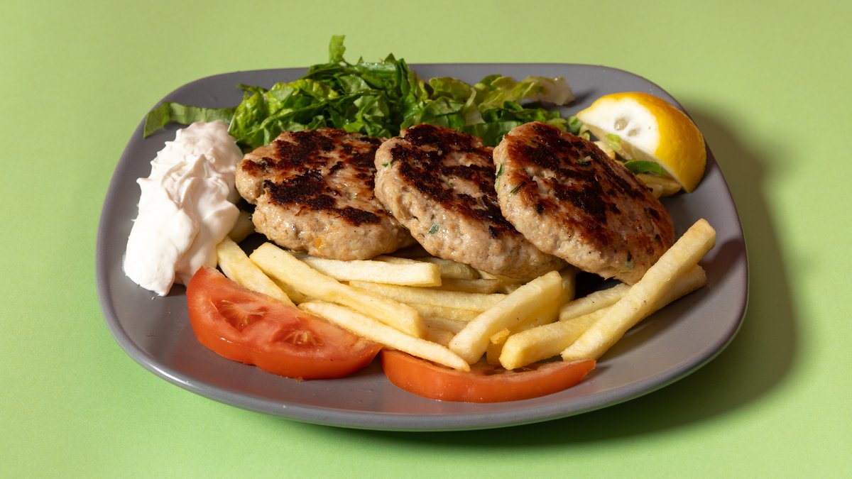 3 Τεμάχια. Συνοδεύεται από ντομάτα, μαρούλι και πατάτες τηγανητές