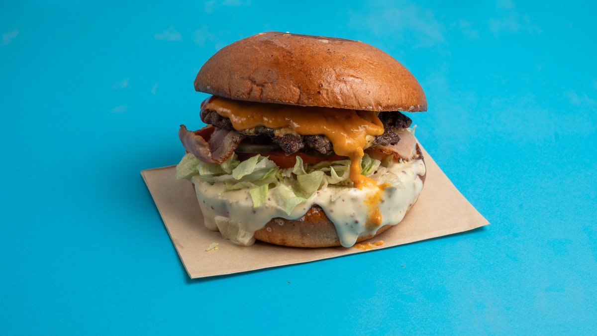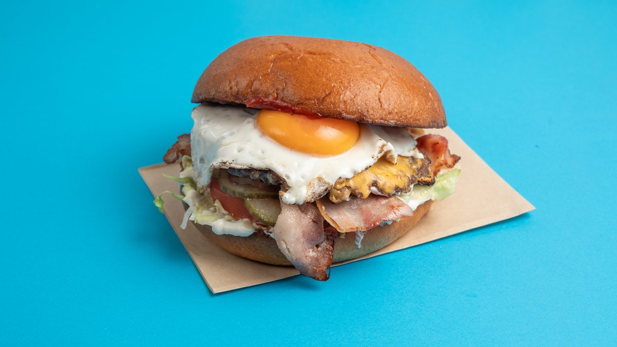 Με μπιφτέκι smash, τυρί τσένταρ, μπεικον, τηγανιτό αυγό, iceberg, ντομάτα, πικλα αγγούρι μαγιονέζα και κέτσαπ