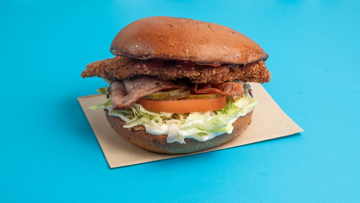 Με κοτόπουλο πάνε, μπεικον, iceberg, ντομάτα, πικλα αγγούρι, μαγιονέζα και κέτσαπ