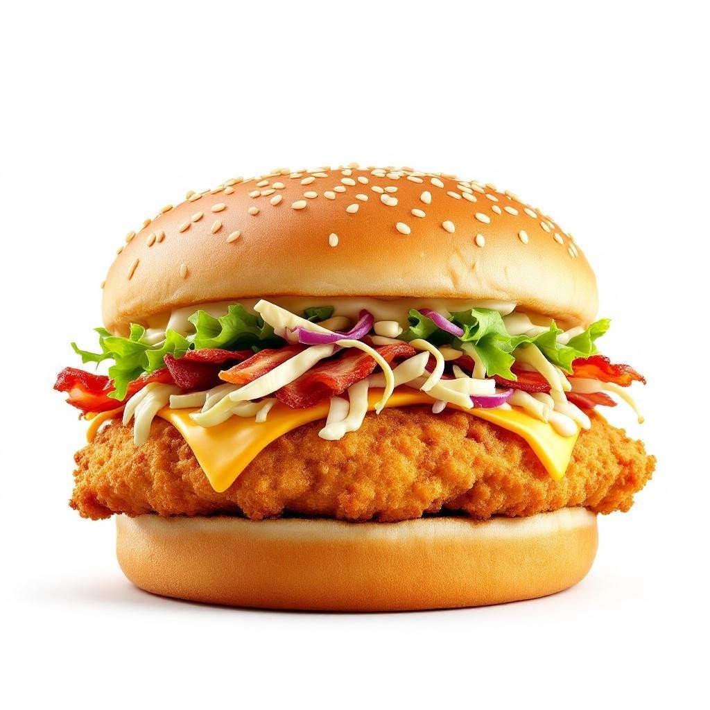 Τραγανό φιλέτο κοτόπουλο, cheddar, καραμελωμένο κρεμμύδι με teriyaki, iceberg και sweet chili mayo