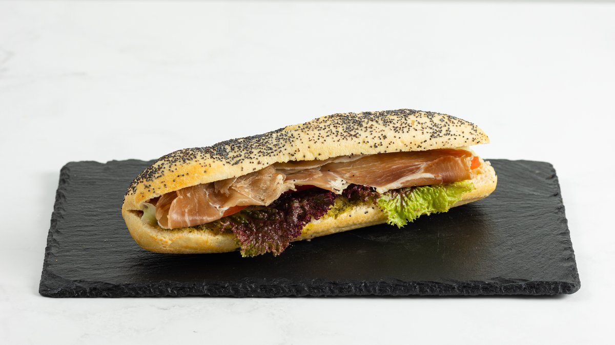 Με χειροποίητο λευκό ψωμάκι, σαλάμι αέρος, μοτσαρέλα, μαρούλι και ντομάτα.