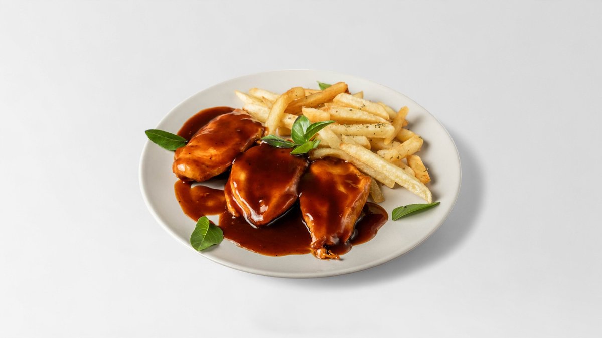 Τρυφερά χοιρινά φιλετάκια λαιμού με πατάτες τηγανητές και σως μελιού
