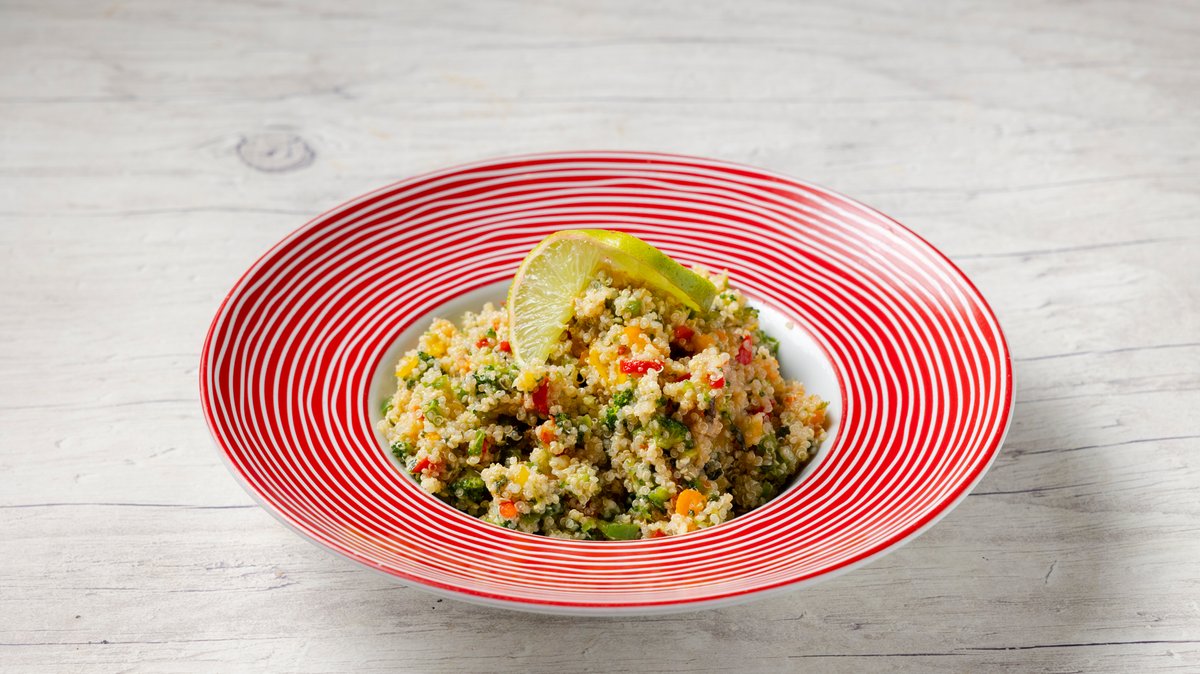 Mε δροσερή σαλάτα με κινόα, πολύχρωμες πιπεριές, μπουκετάκια μπρόκολου, φρέσκο κρεμμυδάκι και γλυκόξινη βινεγκρέτ αρωματισμένη με τζίντζερ και δυόσμο