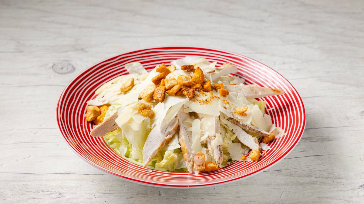 Mε φρέσκο ψητό κοτόπουλο, flakes παρμεζάνας, αρωματικό κρουτόν και βινεγκρέτ μουστάρδας