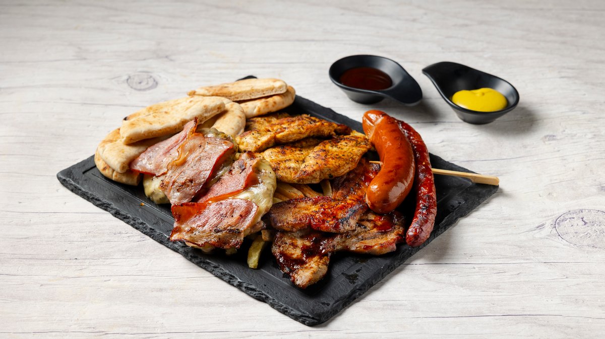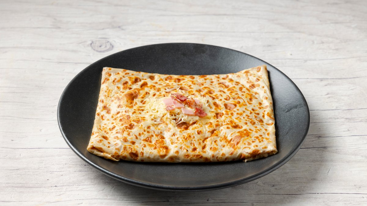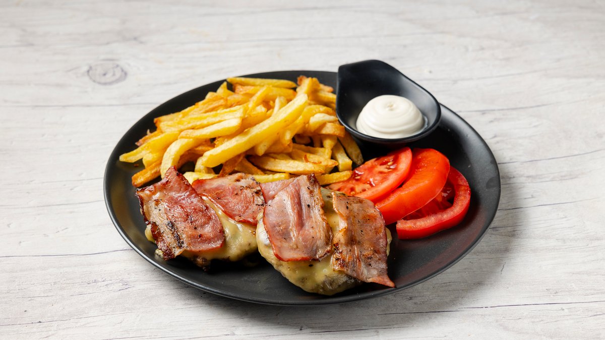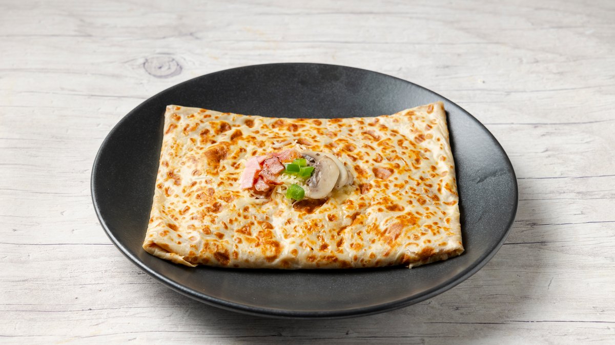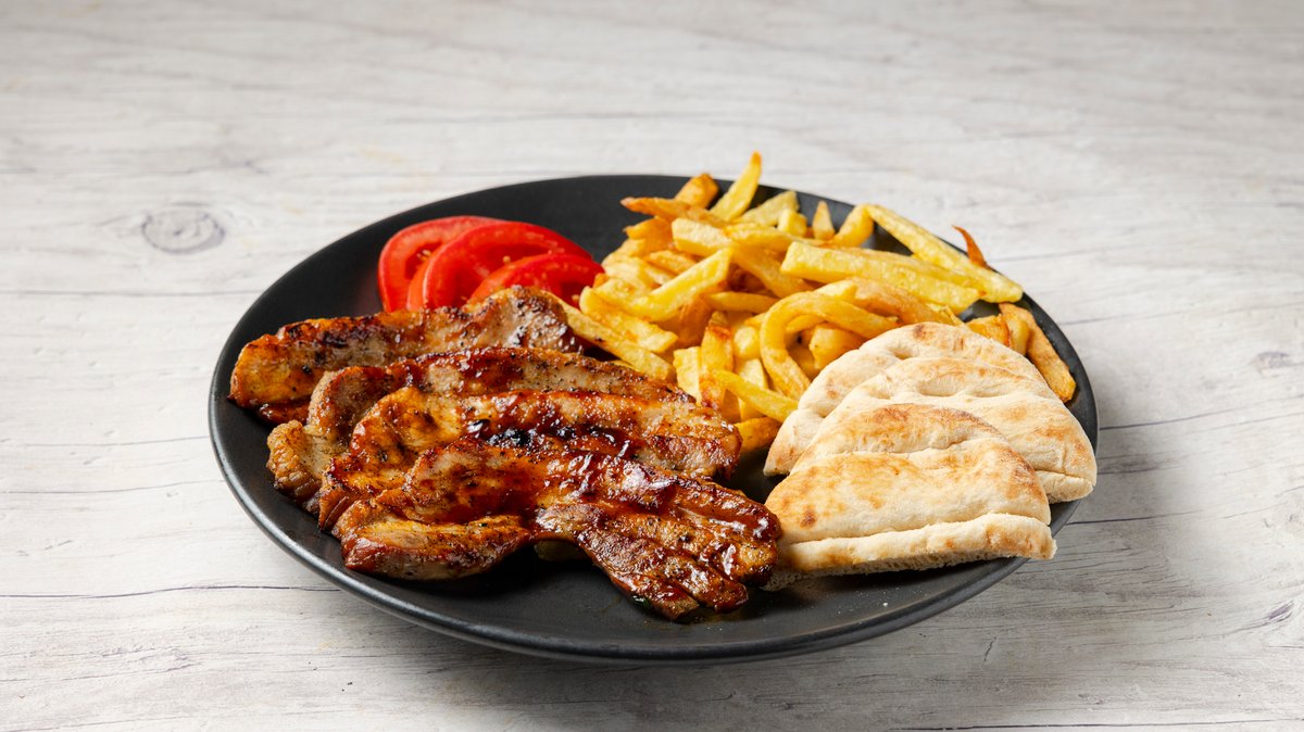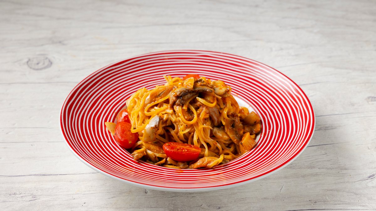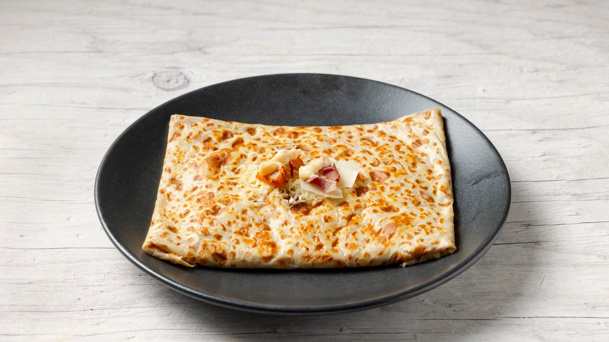 Με χοιρινή ωμοπλάτη, καπνιστή πανσέτα, μανιτάρια, κρεμμύδι, κόκκινη πιπεριά, κρέμα, σάλτσα ντομάτας (συνοδεύεται με τυριέρα)