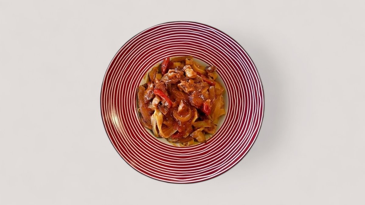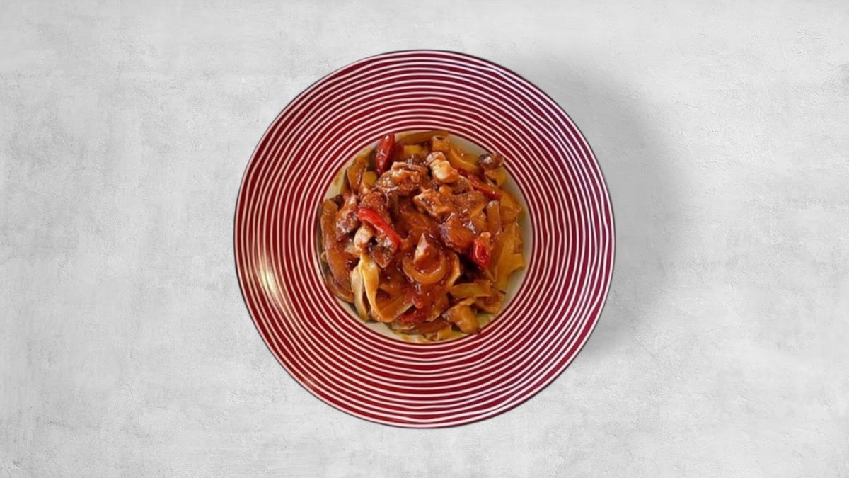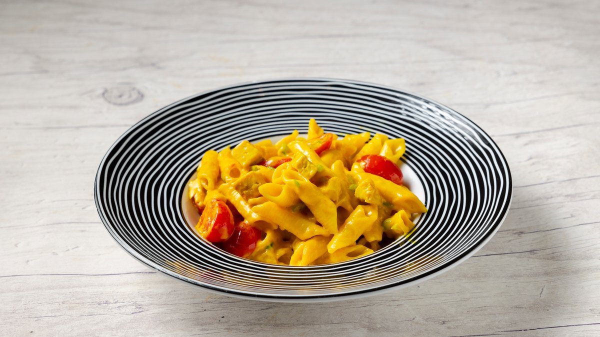Με κοτόπουλο, πιπεριά, κρέμα γάλακτος, ντοματίνια, κουρκουμά (συνοδεύεται με τυριέρα)