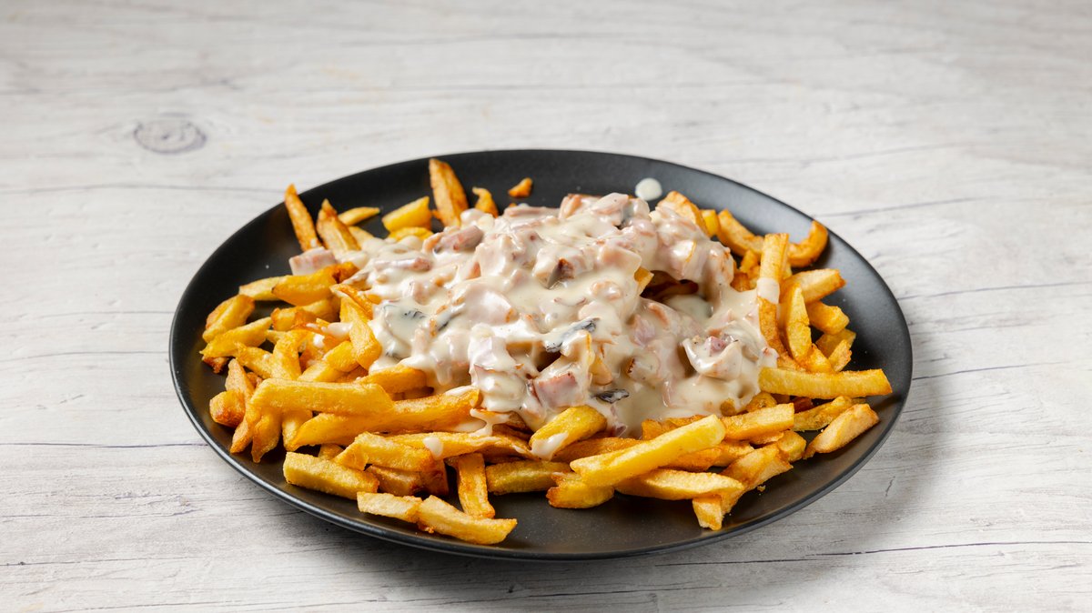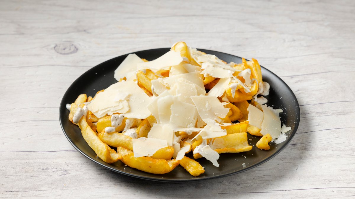 Με κρέμα παρμεζάνας, ντοματίνια πάνω σε φρέσκες τηγανητές πατάτες
