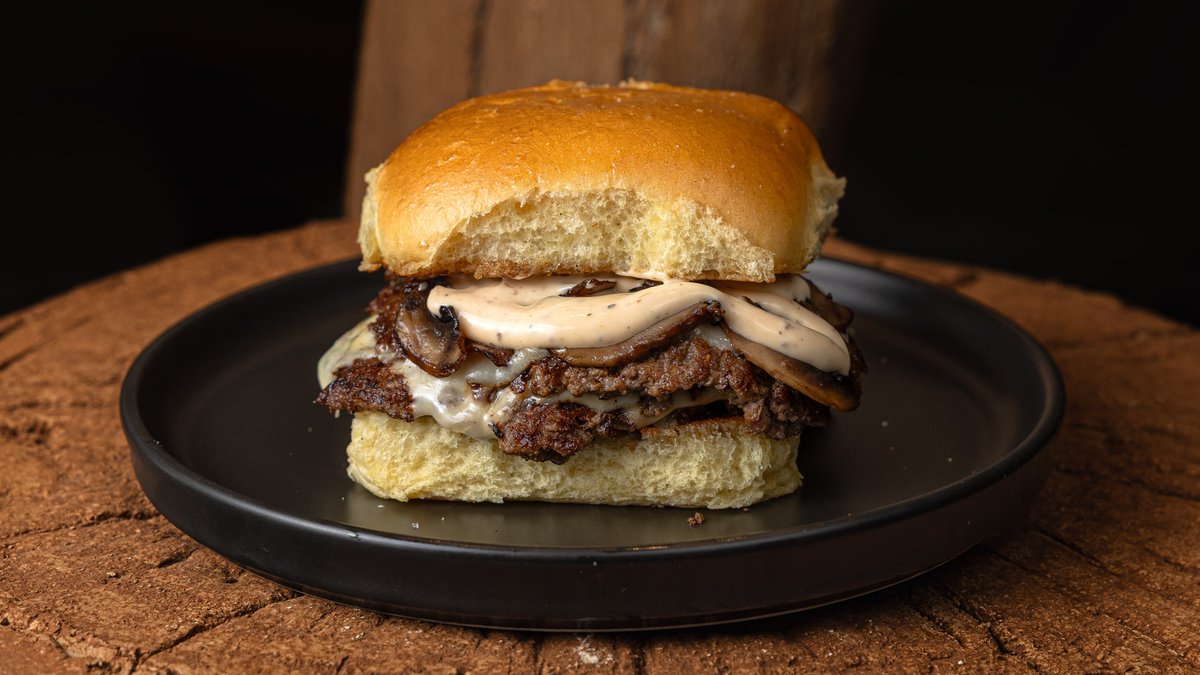 Διπλό smash black angus μπιφτέκι, μανιτάρια, τυρί και truffle mayo