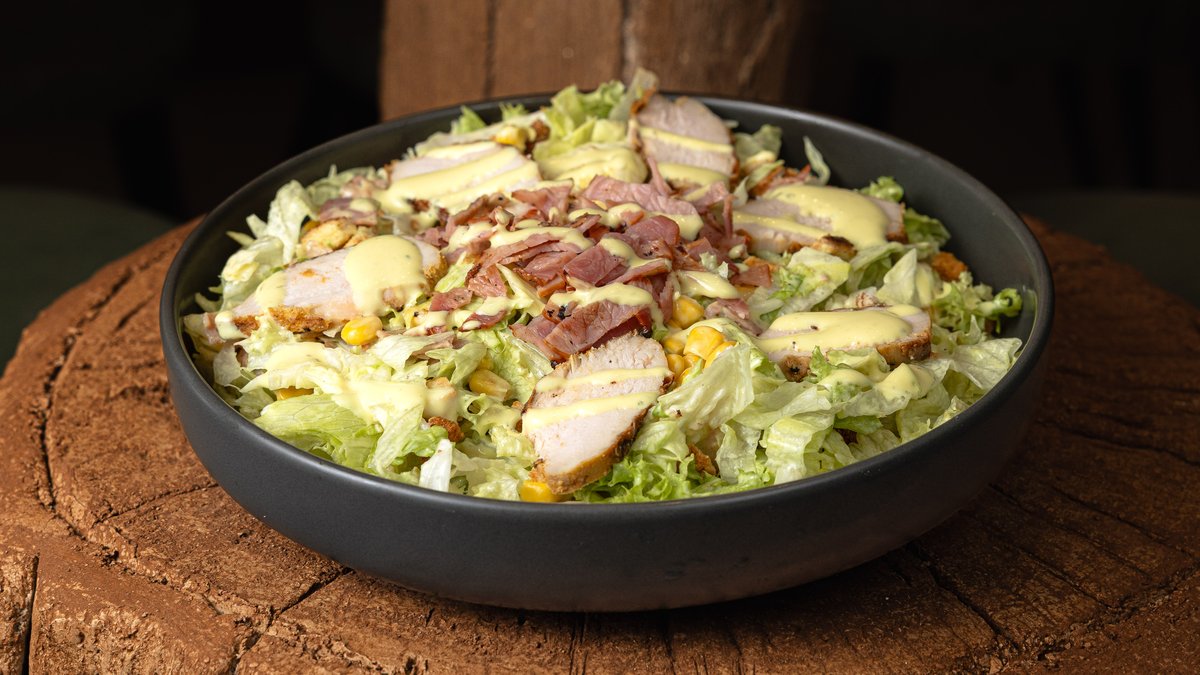 Iceberg, μαρούλι, μπέικον, καλαμπόκι, κοτόπουλο, κρουτόν, νιφάδες παρμεζάνας και σάλτσα caesars