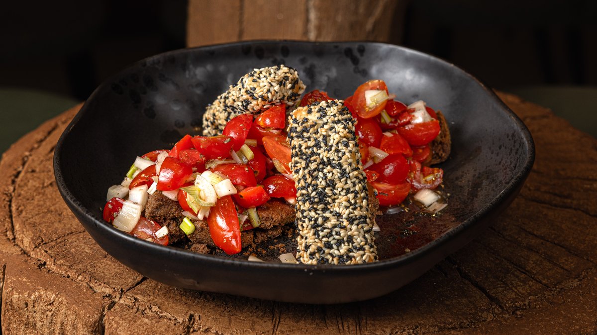 Με παξιμάδι χαρουπιού, ντομάτες, φρέσκα μπαχαρικά, τραγανή φέτα και αρωματικό λάδι μαϊντανού