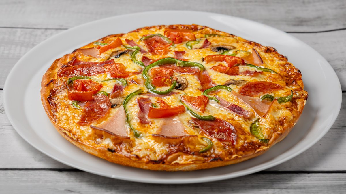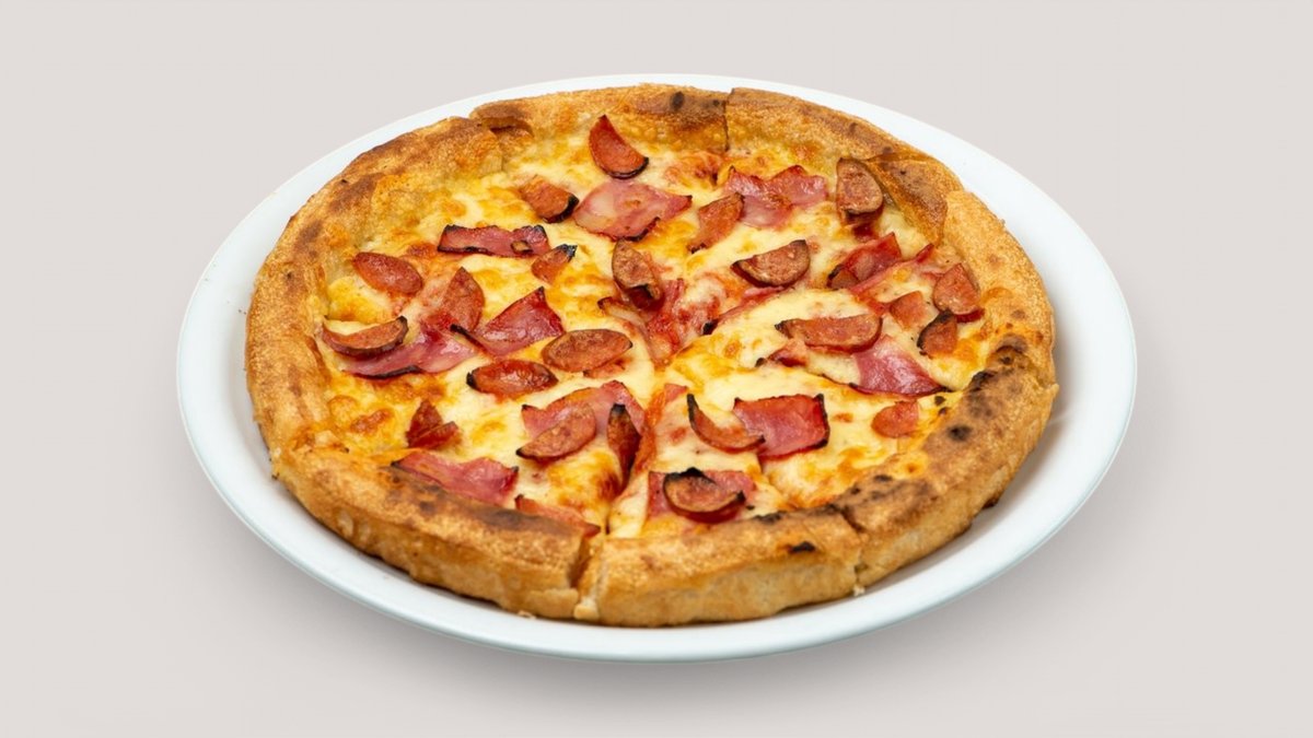 With tomato sauce, gouda, ham, bacon and pepperoni