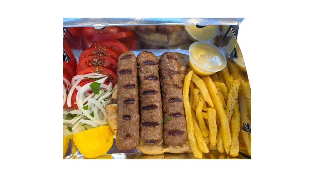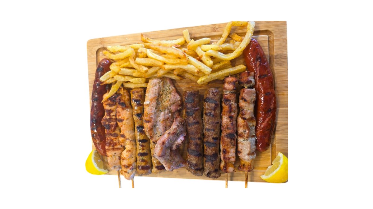 With 2 pork, 2 chicken, 2 beef kebabs, 2 chicken kebabs, 2 pancakes, 1 sausage and potatoes