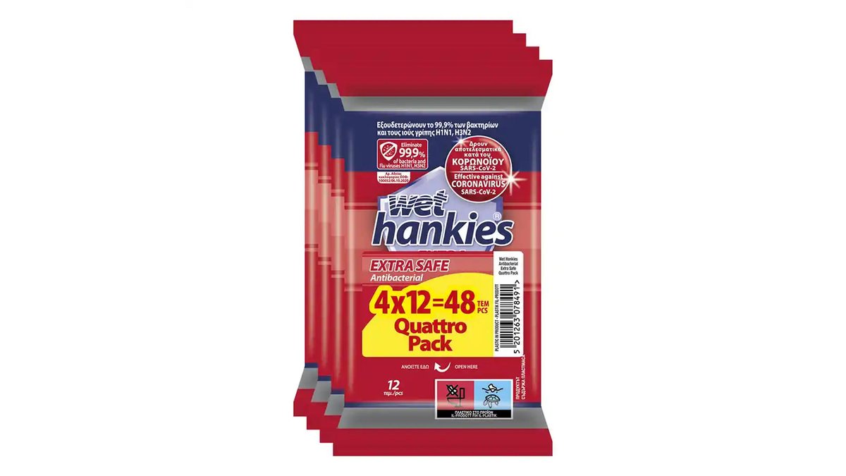 Wet Hankies Υγρά Μαντηλάκια Αντιβακτηριδιακά Extra Safe 4x12τεμ.