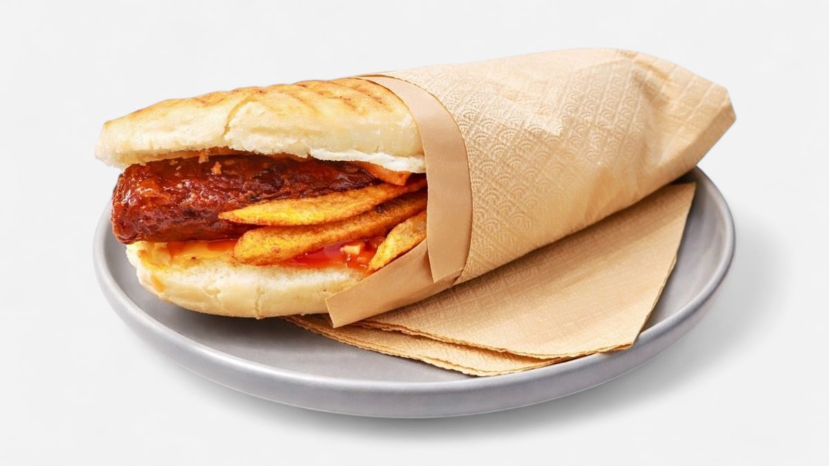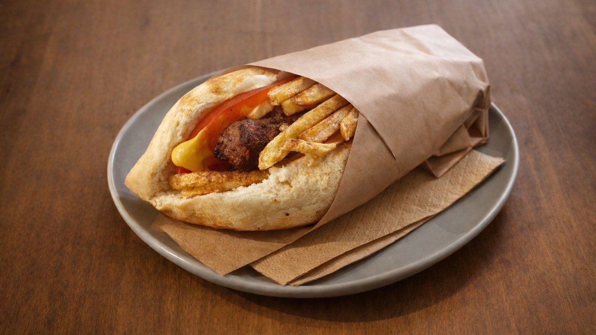 Συνοδεύεται από σαλάτα λάχανο, πατάτες τηγανητές και σως επιλογής