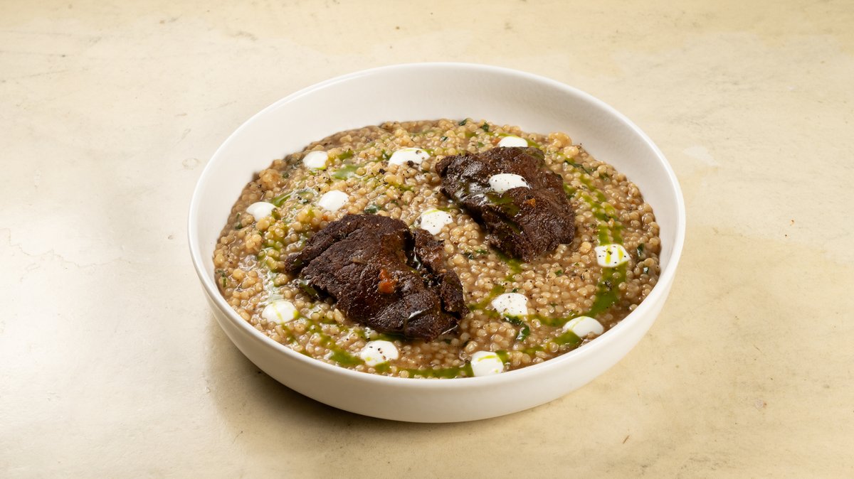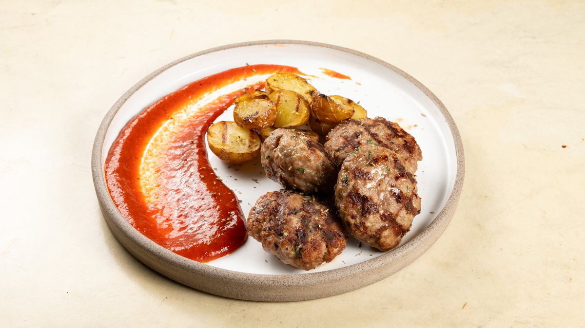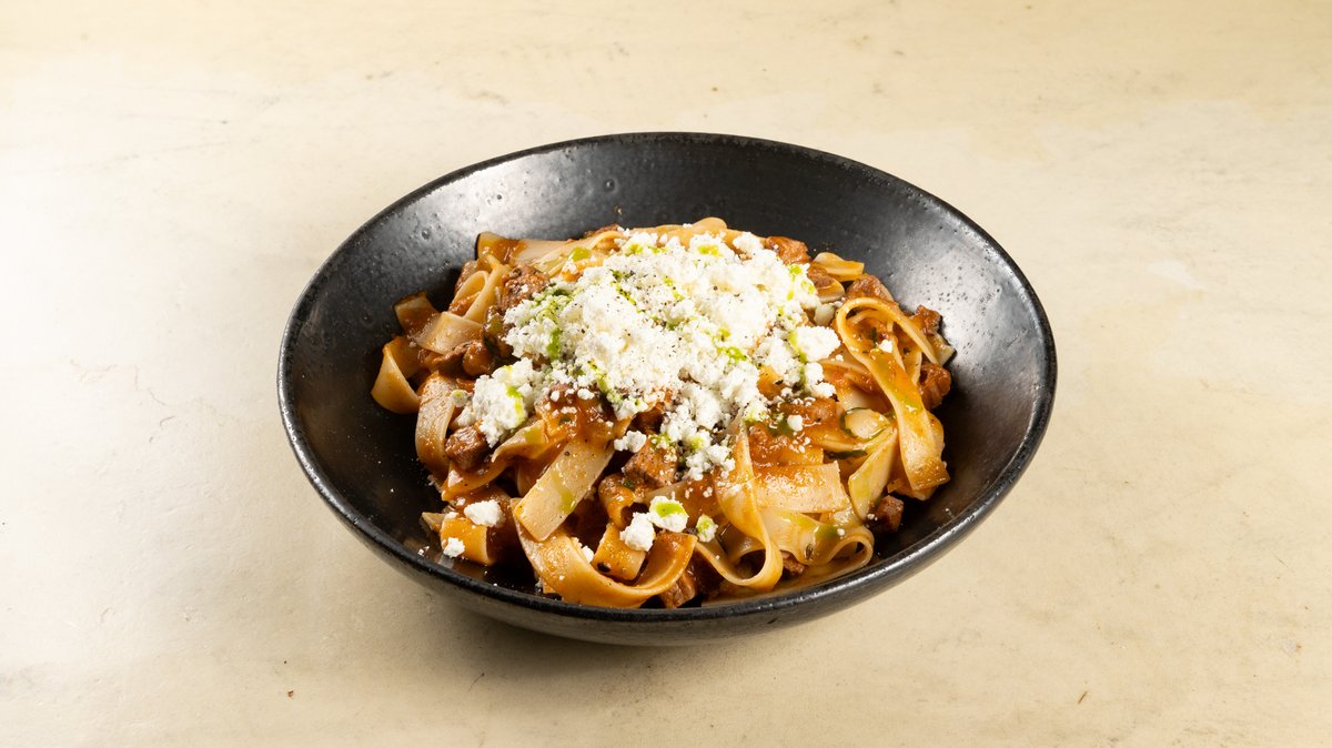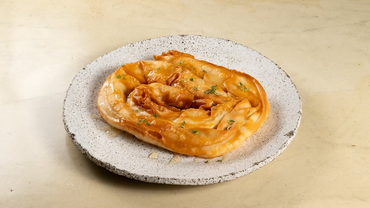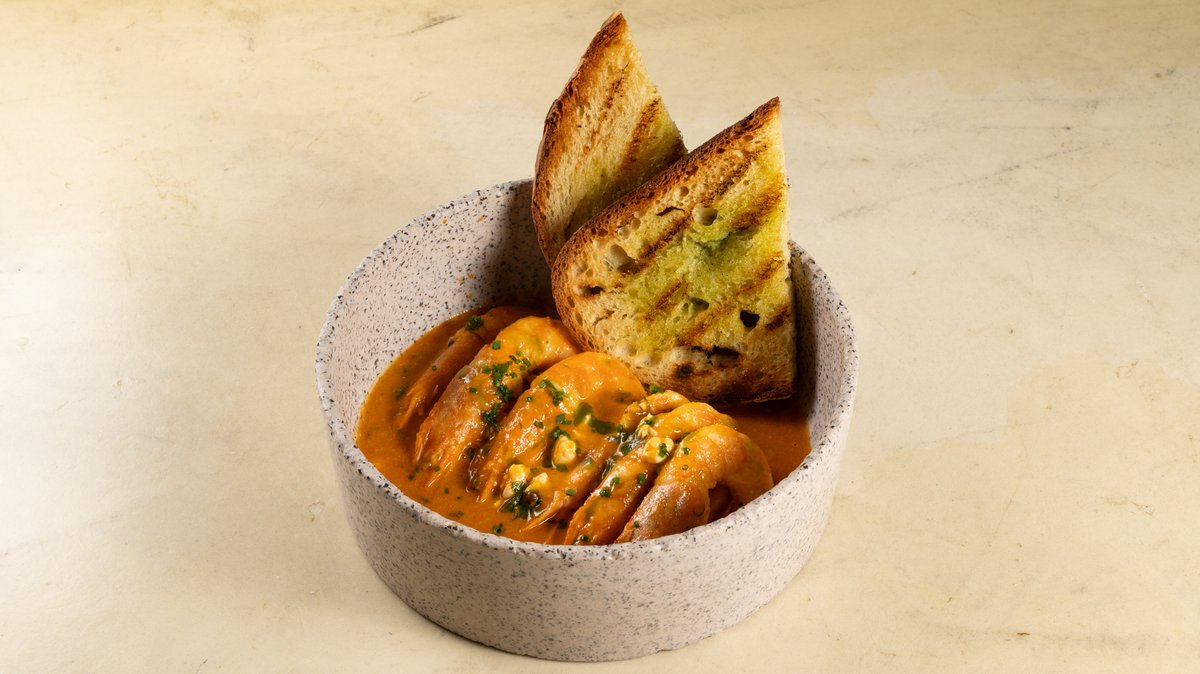 With spicy tomato sauce, feta cheese, herbs and toasted bread