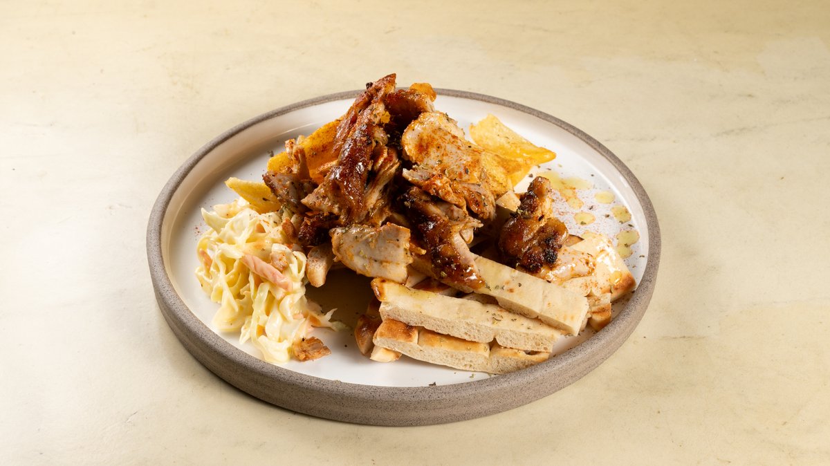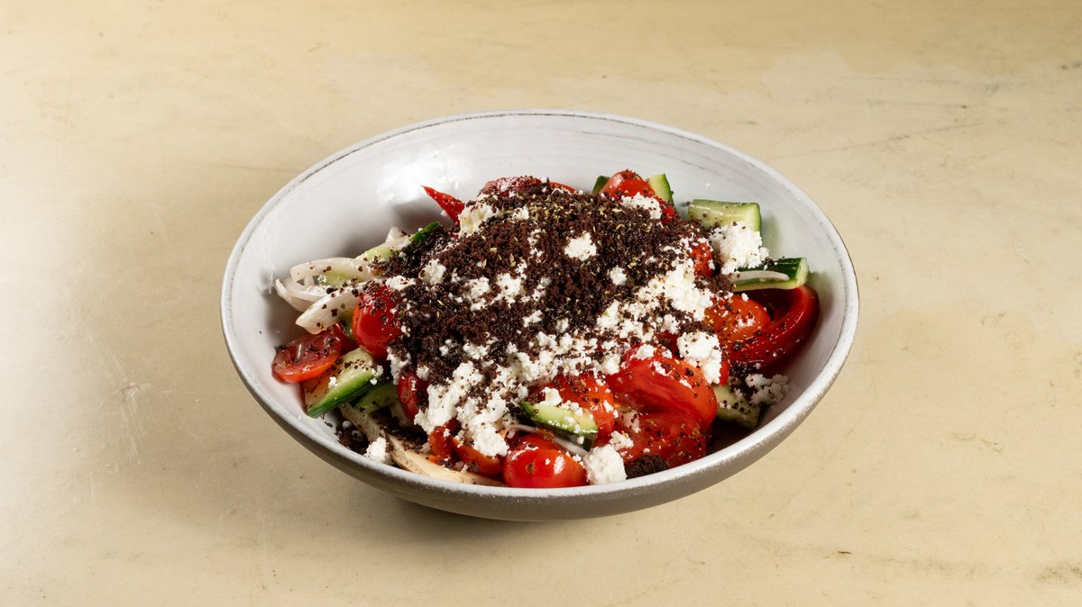 With cherry tomatoes, cucumber, feta cheese, olive oil, onion, pepper and pita bread