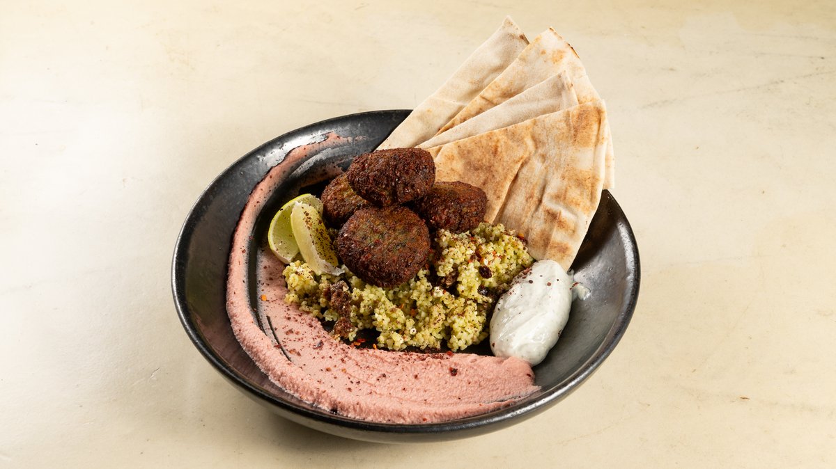 With beetroot hummus, tabbouleh salad, yogurt and Arabic pies