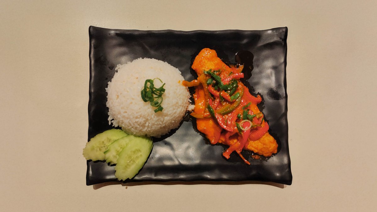 Πικάντικο. Κόκκινο Κάρυ με Γάλα Καρύδας, Φιλέτο Τσιπούρας, Πολύχρωμες Πιπεριές, Δυόσμο & Φρέσκο Κρεμμυδάκι συνοδεία Αρωματικού Ρυζιού