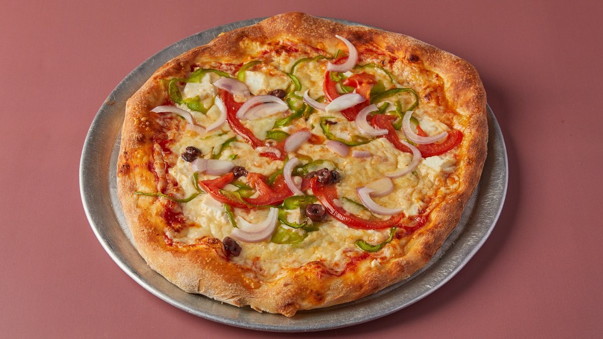 Με σάλτσα ντομάτας, gouda, φέτα, κρεμμύδι, πιπεριά, φρέσκια ντομάτα και ελιές
