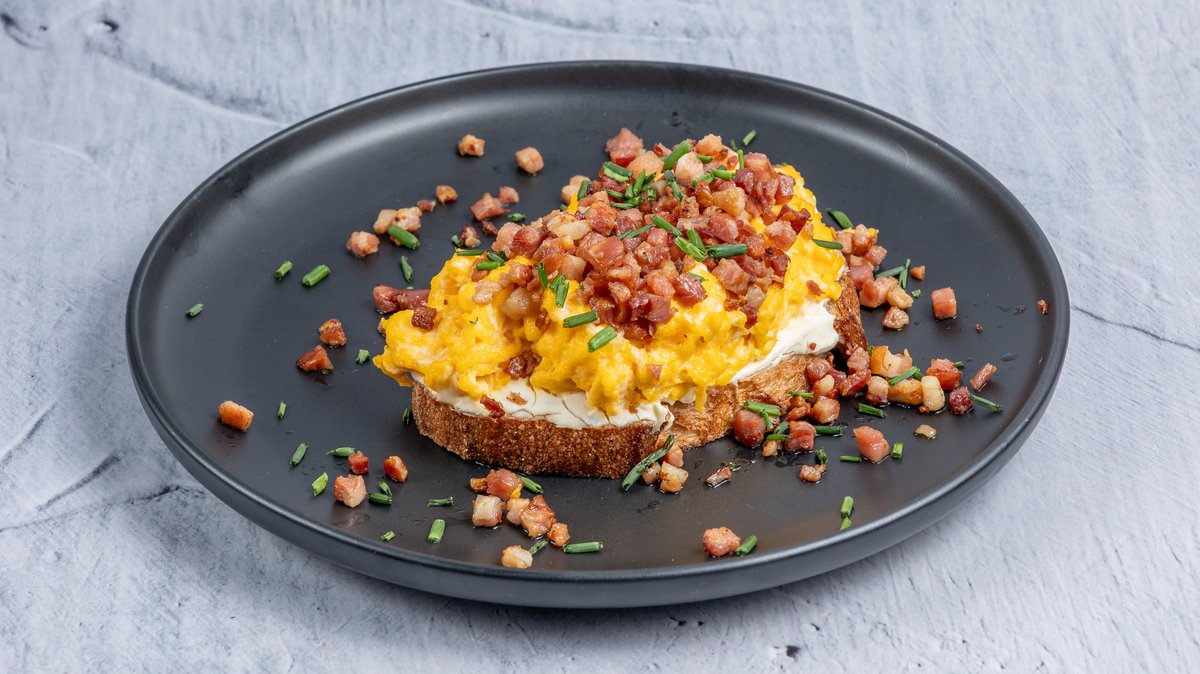 Κρεμώδη scrambled eggs με τραγανό bacon και αέρινη κρέμα παρμεζάνας πάνω σε προζυμένιο ψωμί