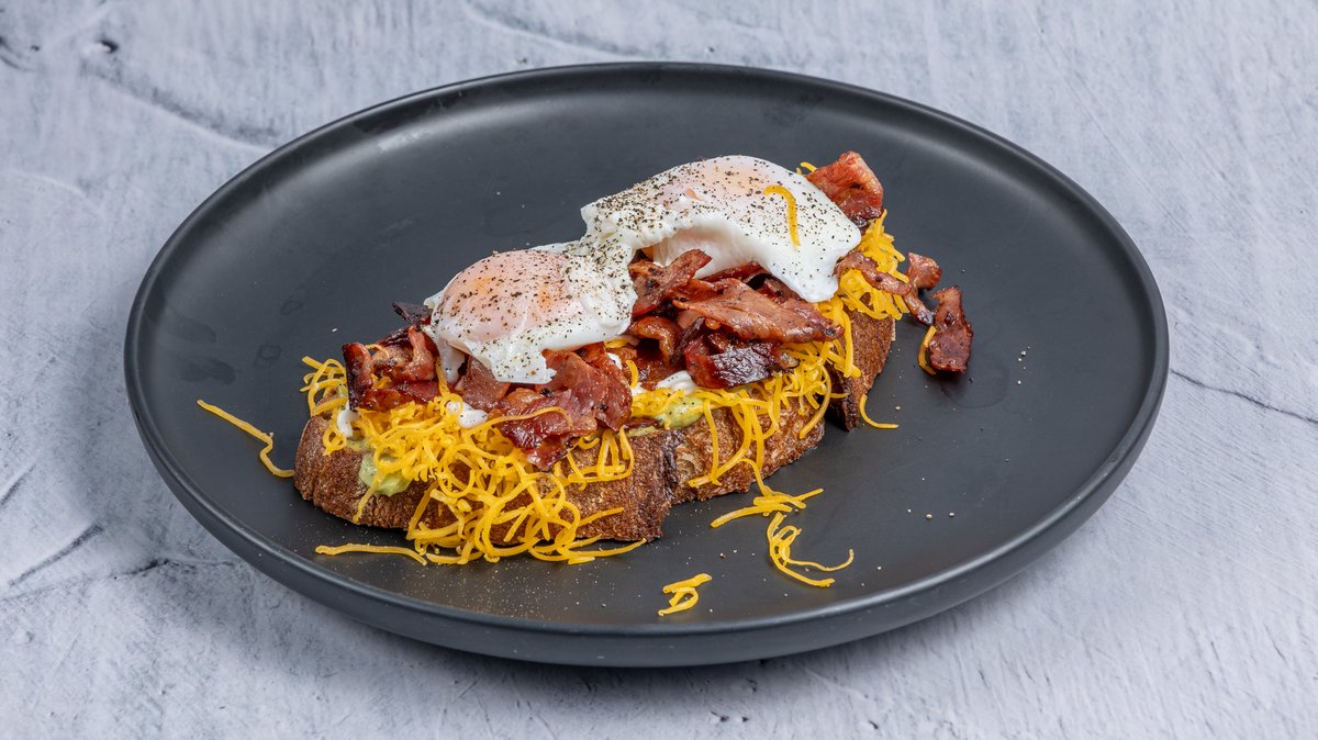 Αυγά ποσέ πάνω σε πλούσιο προζυμένιο ψωμί ολικής άλεσης, χειροποίητη κρέμα αβοκάντο, μαγιονέζα, τριμμένο τσένταρ και τραγανό μπέικον