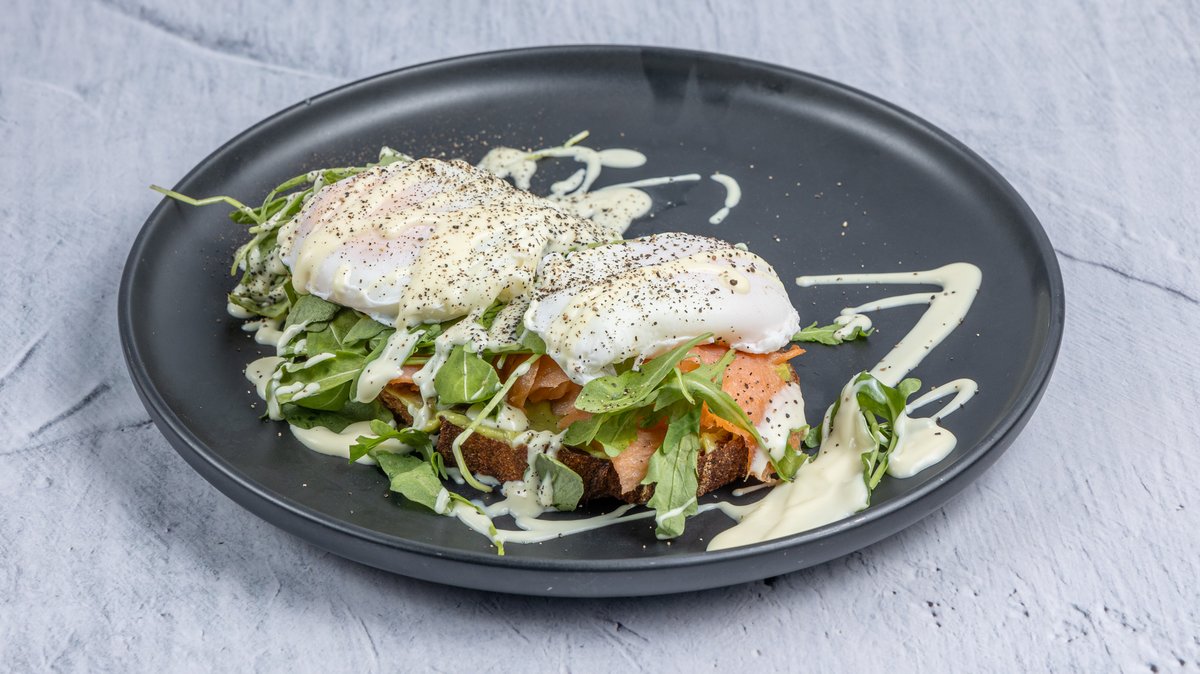 Αυγά ποσέ πάνω σε προζυμένιο ψωμί ολικής άλεσης, λαχταριστό σολομό, κρέμα αβοκάντο, baby ρόκα και απολαυστική σάλτσα