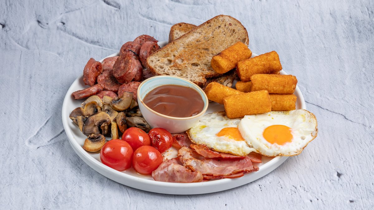 Αυγά μάτια, τραγανό μπέικον, χωριάτικο λουκάνικο, ζουμερά ντοματίνια, σωτέ μανιτάρια, χρυσαφένιες κροκέτες πατάτας, κέτσαπ και φρυγανισμένο προζυμένιο ψωμί
