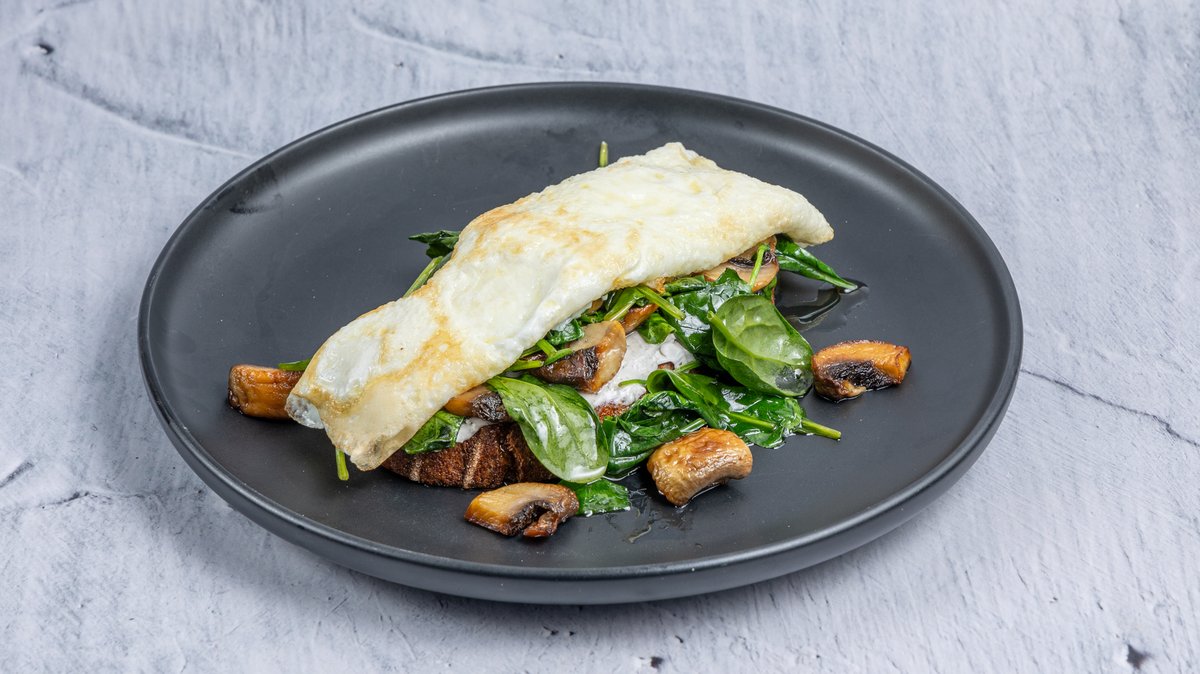 Ασπράδια αυγών, tofu, baby σπανάκι, σωταρισμένα φρέσκα ντοματίνια, εκλεκτό λάδι τρούφας και μαγιονέζα τρούφας πάνω σε προζυμένιο ψωμί ολικής άλεσης