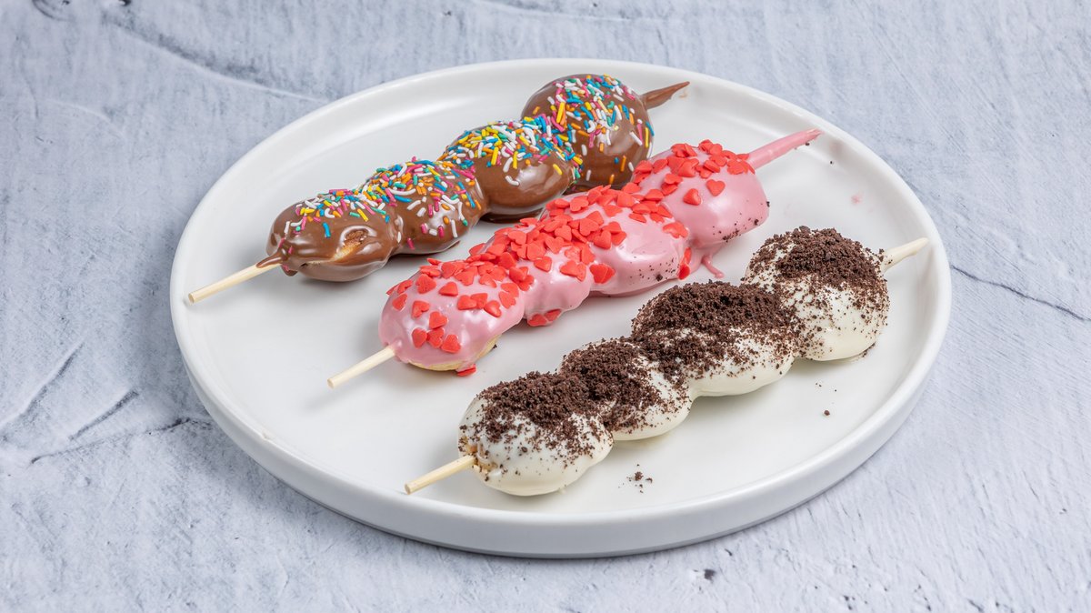 Τρία σουβλάκια από mini pancake με τέσσερα mini pancake σε κάθε ξυλάκι με λευκή πραλινα μπισκότο oreo, πραλίνα φράουλα με κόκκινες καρδιές και πραλίνα σοκολάτας με τρούφα πολύχρωμη.