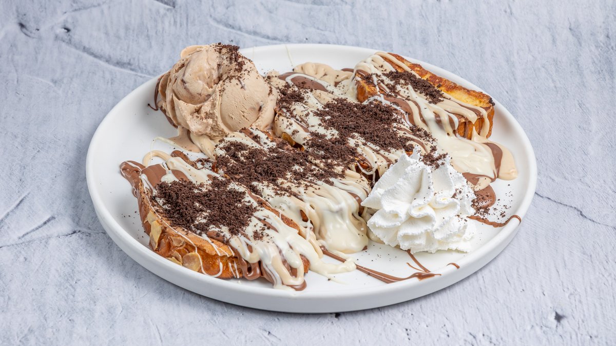 Τσουρέκι αυγοφέτα με τρεις λαχταριστές πραλίνες: σοκολάτα γάλακτος, bueno, και λευκής σοκολάτας, με χειροποίητο gelato bueno και τριμμένο μπισκότο oreo