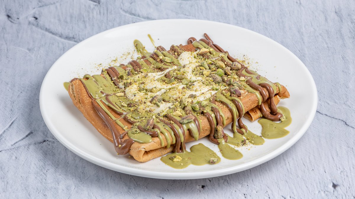 Ρολό κρέπας με πραλίνα σοκολάτας,πραλινα φυστίκι, βουτυρωμένο καταΐφι και φυστίκι Αιγίνης