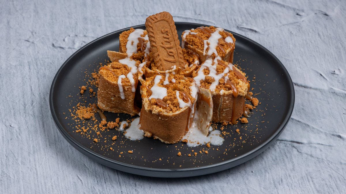 Roll κρέπας κομμένο σαν cinnamon buns με χειροποίητη κρέμα lotus biscoff, χειροποίητο σιρόπι καραμέλας μπισκότο lotus και χειροποίητο γλάσo
