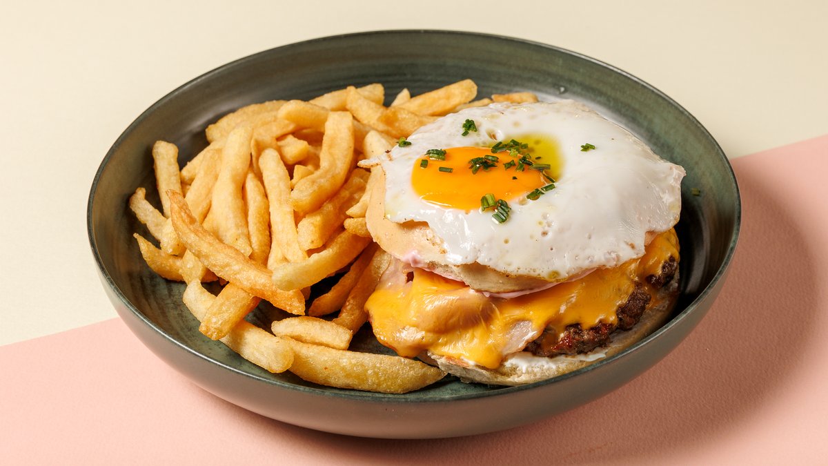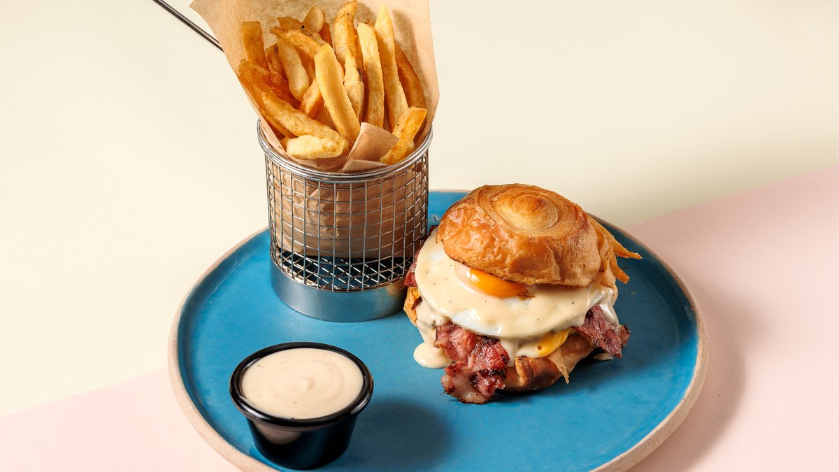 Dry aged smashed burger σε προζυμένιο croissant με τυρί cheddar, μαγιονέζα, black pepper mayo, αβγό, μπέικον και φρέσκιες τηγανίτες πατάτες
