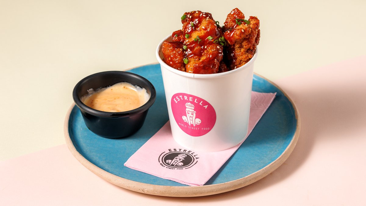 5-6 Τεμάχια. Τραγανό τηγανητό κοτόπουλο σε κουβαδάκι με Korean (honey&miso sause). Συνοδεύεται με Korean mayo και φρέσκιες τηγανίτες πατάτες