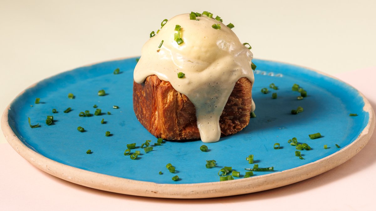 Σε ζύμη από κουλούρι Θεσσαλονίκης με 2 τηγαnητά αβγά, κρέμα αβοκάντο, γραβιέρα, κρέμα φέτας και πικάντικη κόκκινη σάλτσα