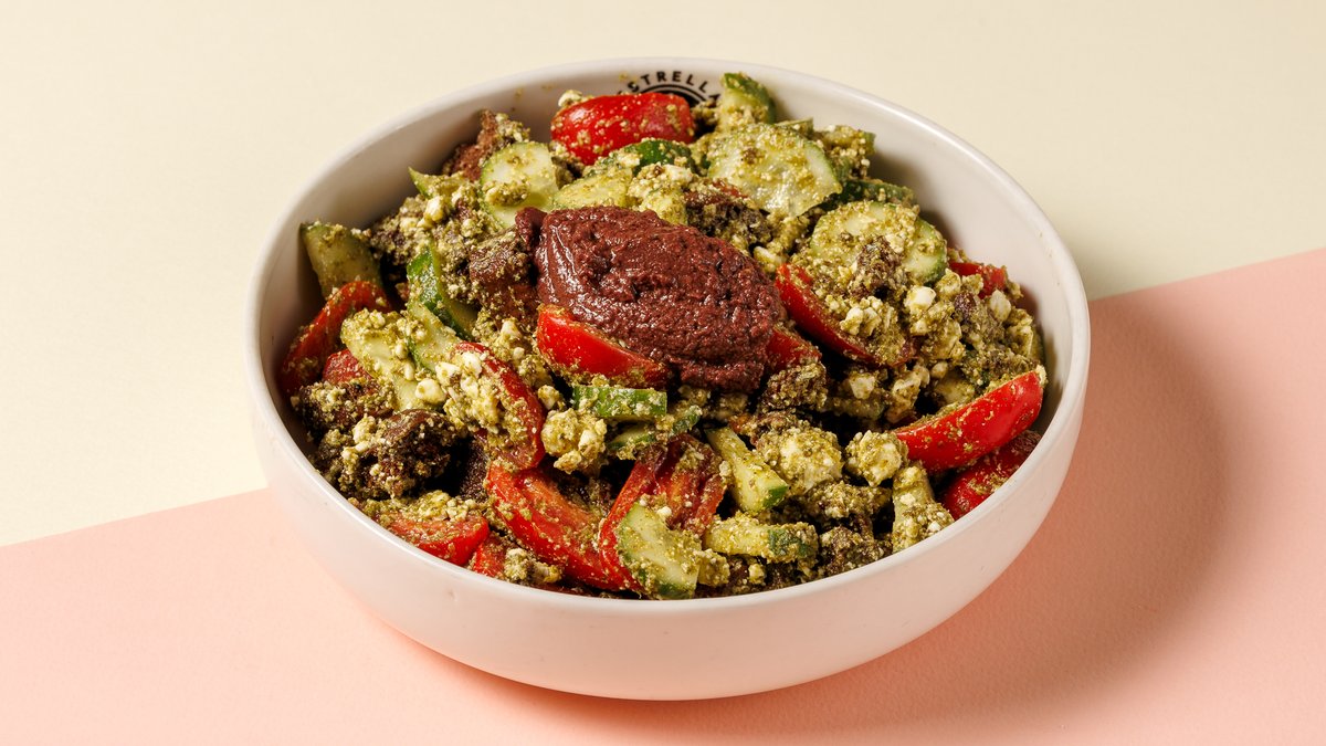 Με ψητά ντοματίνια, 2 αυγά βραστά, κρέμα φέτας, φρέσκο κρεμμύδι, πάστα ελιάς και πικάντικο λάδι πάπρικας σε ψωμί dinkel (περιέχει ξηρούς καρπούς)