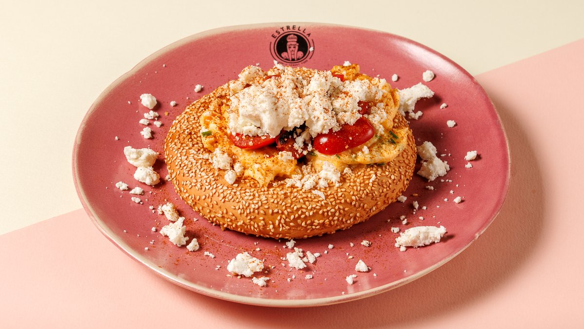Οriginal New York bagel με μπιφτέκι μοσχαρίσιο ωρίμανσης, μπέικον, cheddar, αυγό τηγανητό, κρέμα φέτας, πράσινη σαλάτα εποχής & σπιτική μαγιονέζα (περιέχει παντζάρι). Συνοδεύεται από πατάτες τηγανητές