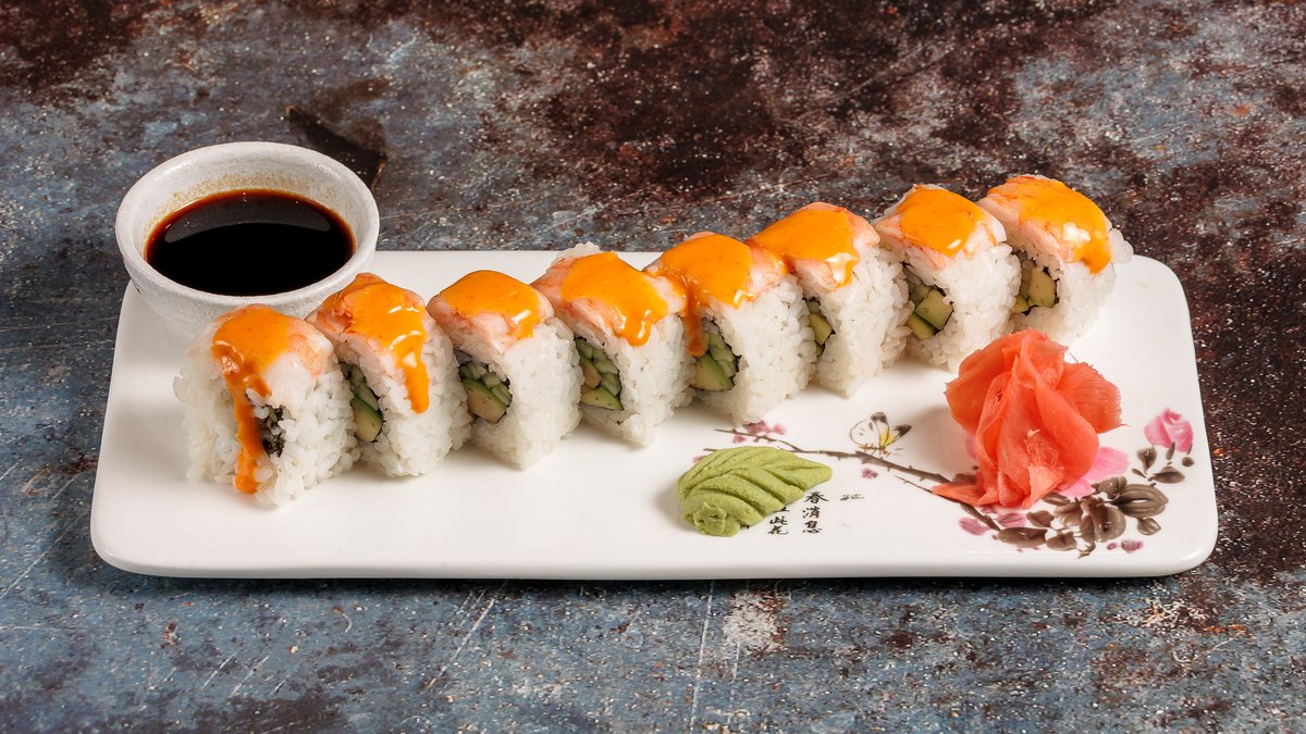 Με σολομό, αγγούρι, καυτερή σάλτσα, κόκκινο και πράσινο tobiko