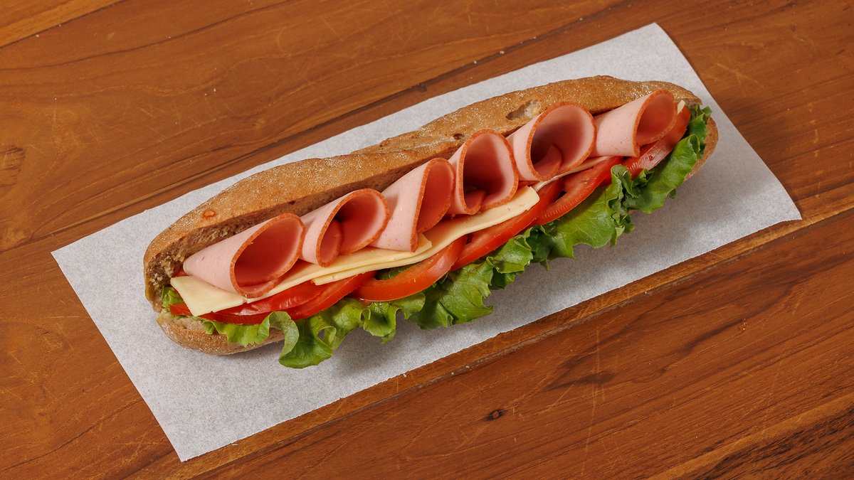Μπαγκέτα Ολικής με Γαλοπούλα , Γκούντα , Μαρούλι ,Ντομάτα και Σος Μουστάρδας