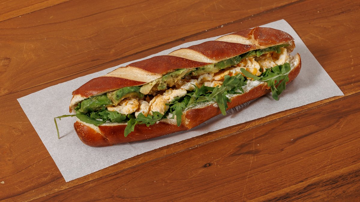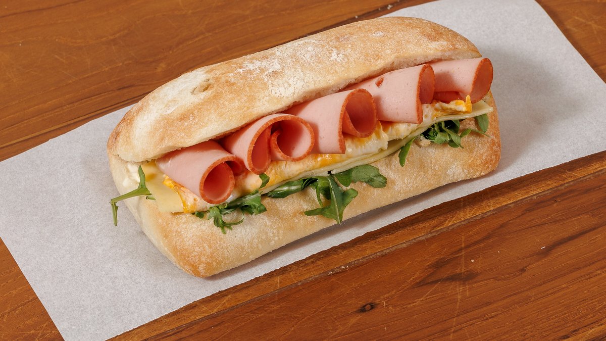 Τσιαπάτα με ομελέτα , γαλοπούλα , γκούντα , ρόκα και μαγιονέζα